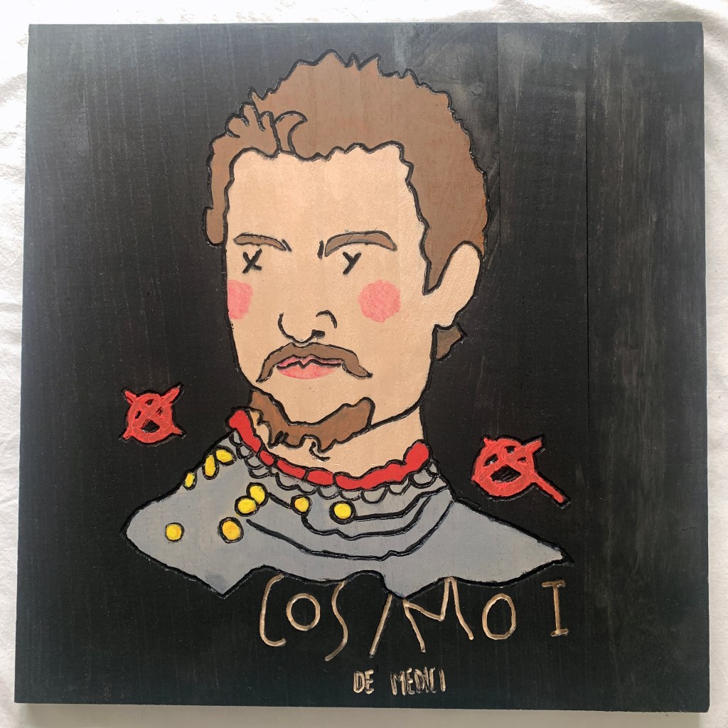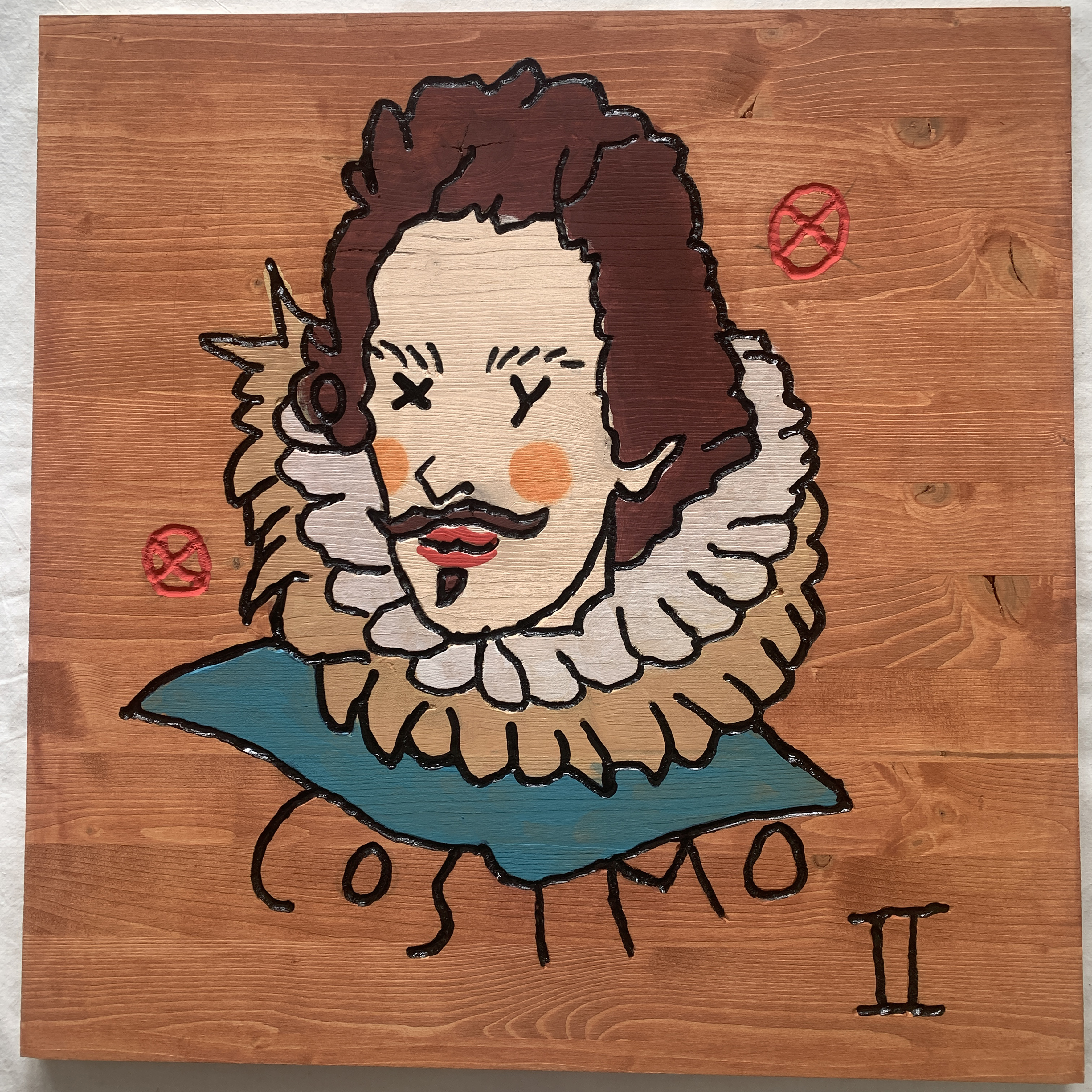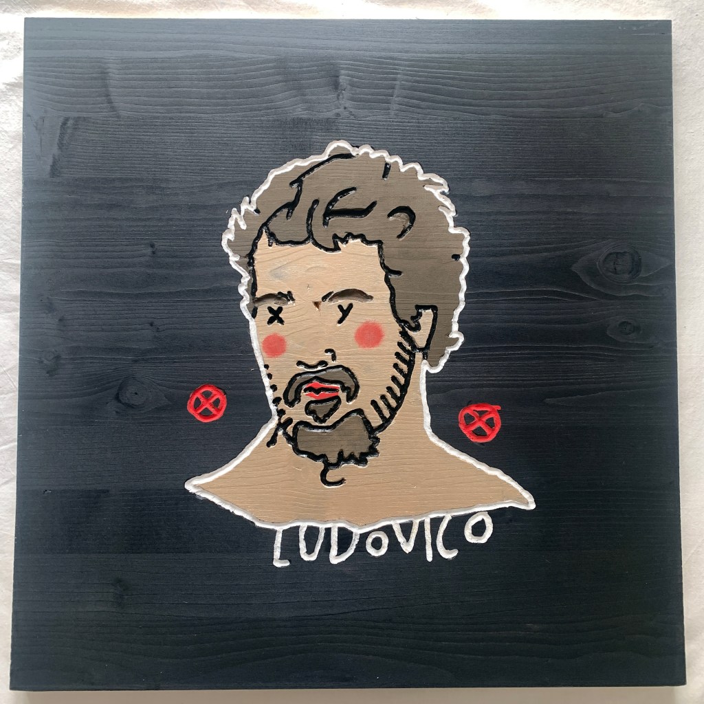 In 2025, he presents the solo exhibition “XXY – de’ Medici” at the Museo de’ Medici in Florence. The project comprises a series of stylized portraits depicting members of the Medici family and key figures of the Renaissance. Executed on painted and engraved wooden panels, the portraits are assembled into sculptural modular cubes. These works reflect on themes of power, patronage, and legacy, creating a visual and conceptual bridge between historical and contemporary modes of representation. The exhibition also features site-specific wall drawings designed in continuity with the portrait series.