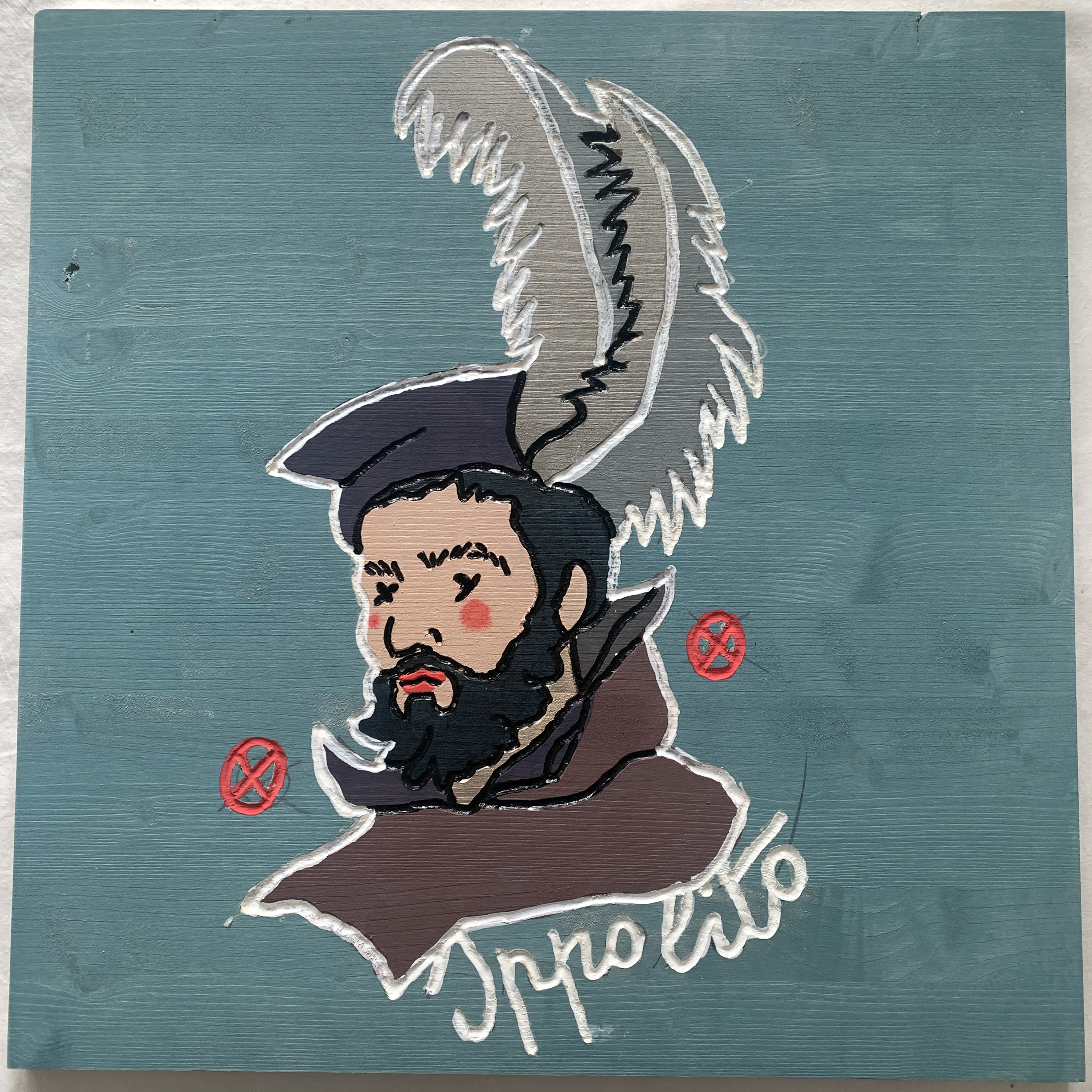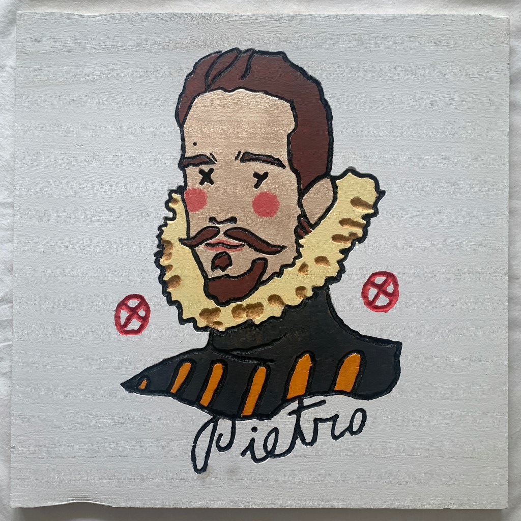 In addition to the main works on wood, Zanolari will draw directly onto the museum’s greenhouse walls in black marker, depicting additional figures connected to the Medici era. These include Leonardo da Vinci, Botticelli, Michelangelo, Machiavelli, Marsilio Ficino, Galileo Galilei, and the famous “Porcellino” of Florence—all rendered in the same stylized, monochromatic aesthetic.