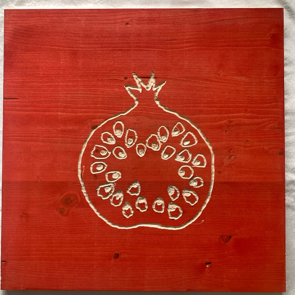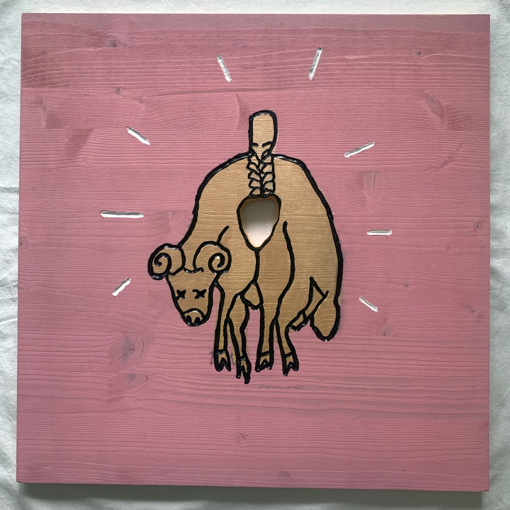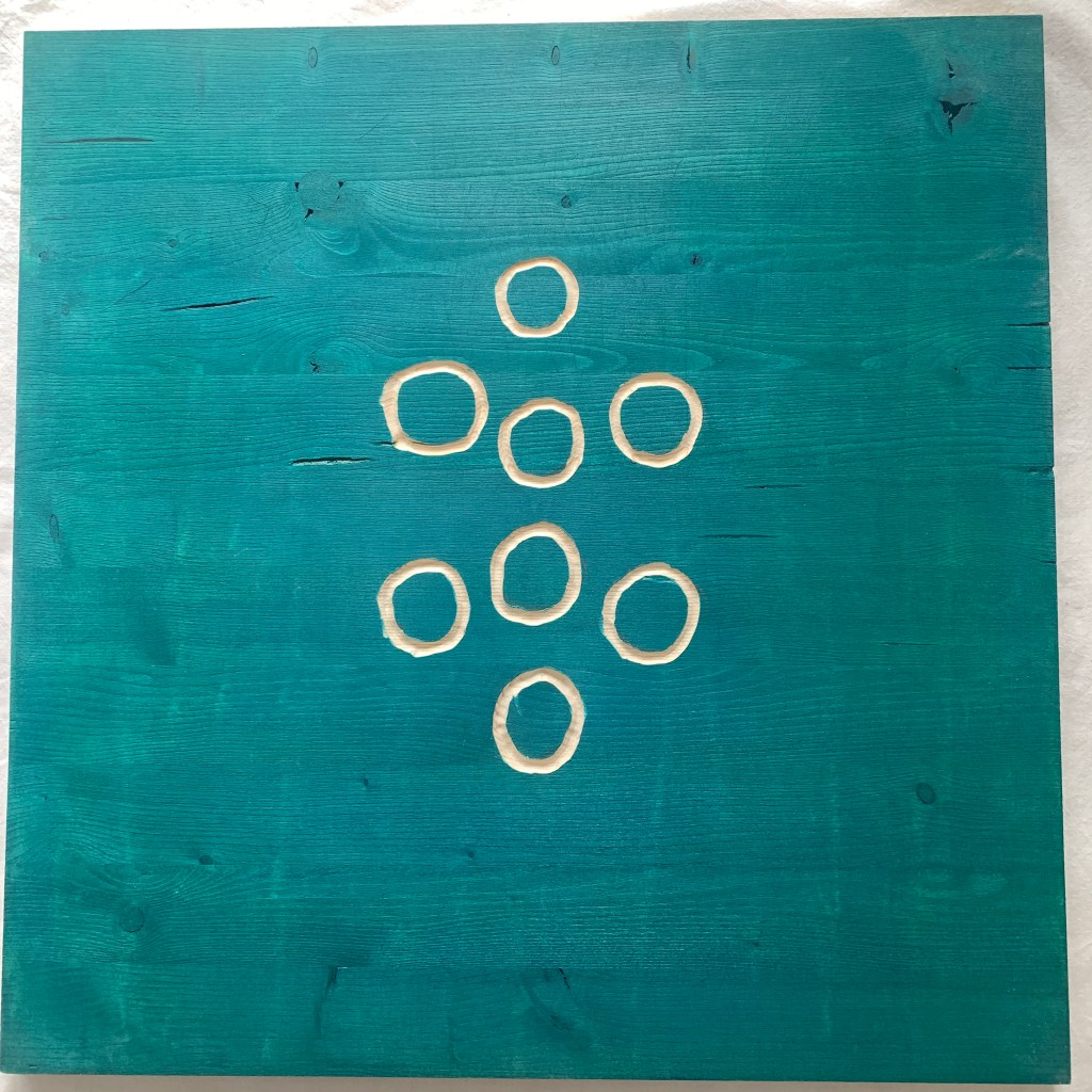 The exhibition consists of 30 hand-painted and engraved wooden panels (50×50 cm each). Three panels form the visible sides of each open-top and open-bottom cube, while the fourth side is left blank or engraved with symbolic motifs. These cubes are stacked into five vertical totems, creating an immersive installation that transforms the exhibition space into a sort of visual temple of memory.